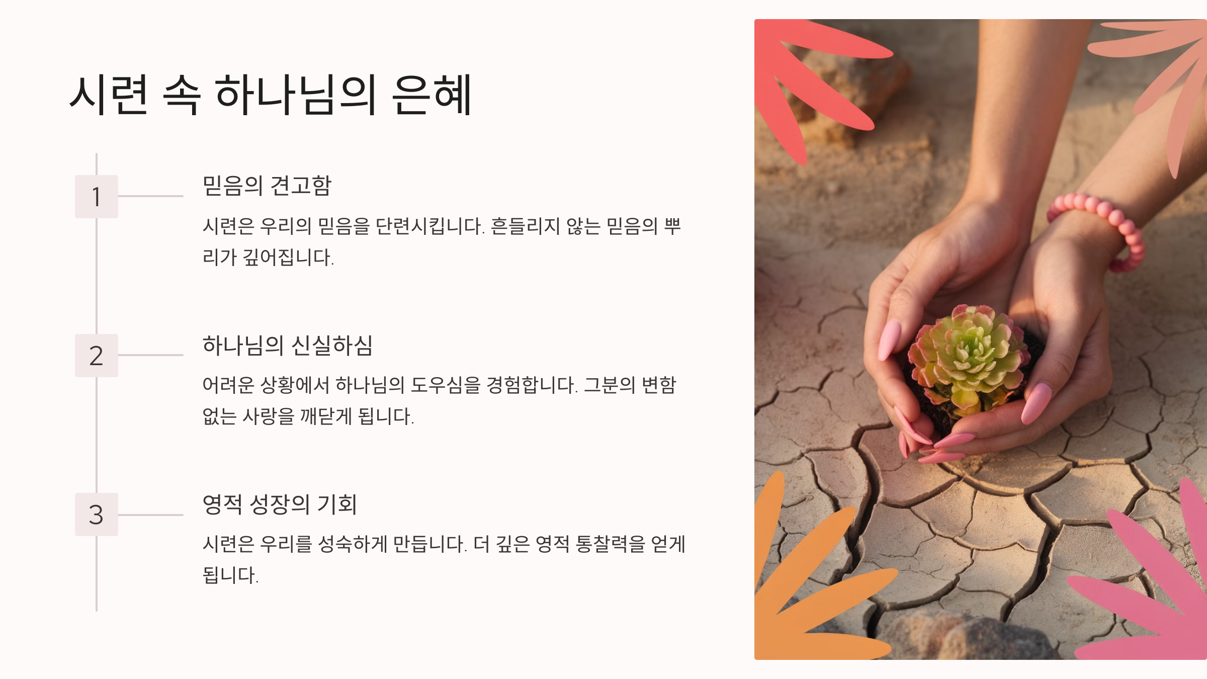 하나님께서는 우리가 시련을 통과할 때 놀라운 은혜를 예비하고 계십니다. 시련은 우리의 믿음을 더욱 견고하게 만들고, 하나님의 신실하심을 더 깊이 경험하게 합니다. 우리가 피하고 싶은 그 순간이 오히려 영적 성장의 가장 귀한 기회가 될 수 있습니다.