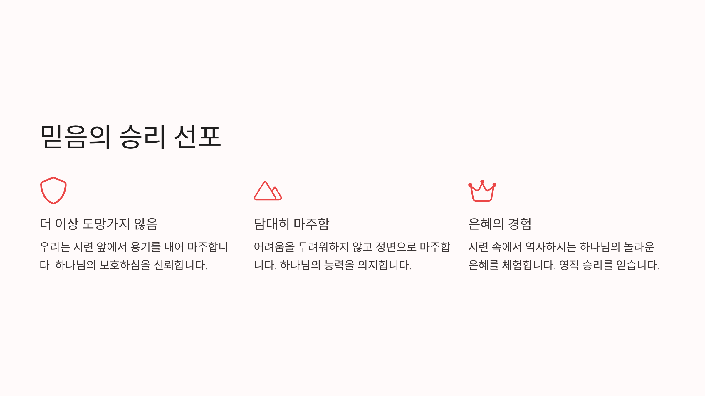 오늘도 우리는 믿음으로 선포합니다. 우리는 더 이상 도망가지 않겠습니다. 시련이 올 때 담대히 마주하며, 그 속에서 역사하시는 하나님의 은혜를 경험하겠습니다. 이것이 진정한 믿음의 승리입니다.